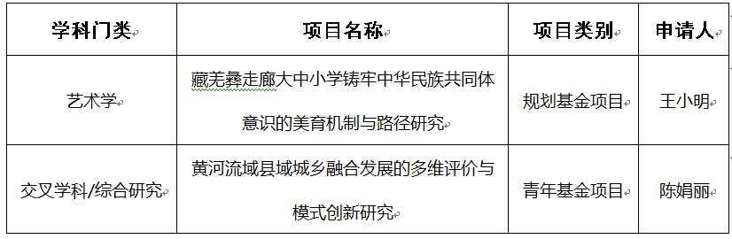 获批立项的规划基金项目为王小明教授的《藏羌彝走廊大中小学铸牢中华民族共同体意识的美育机制与路径研究》该项目以学校美育为切入点,探讨羌彝走廊大中小学校铸牢中华民族共同体意识教育的理论与实践问题,可为藏羌彝走廊提供铸牢中华民族共同体意识的教育方案,为民族地区大中小学美育教育提供可复制、可推广的实践路径。