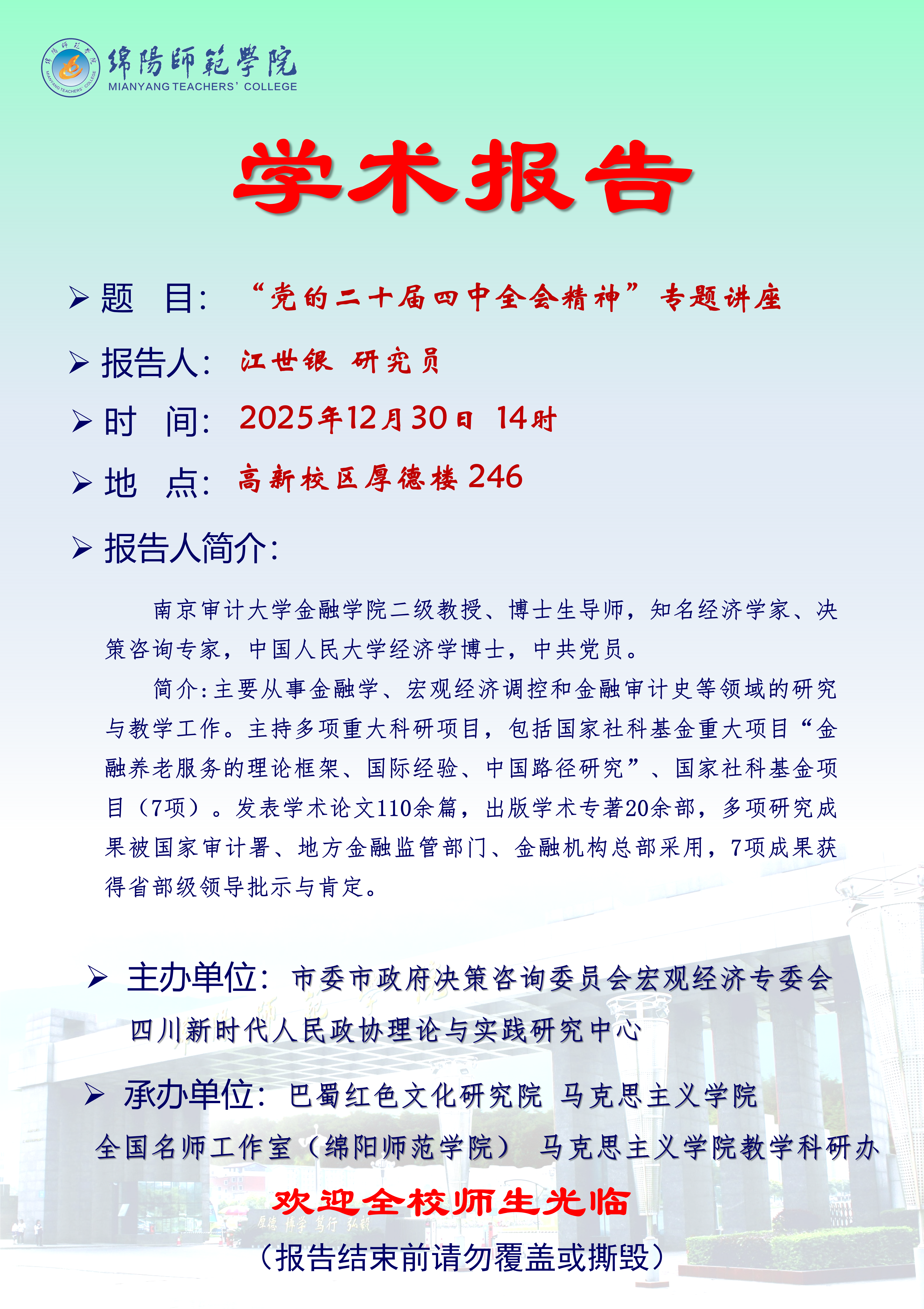 学术讲座预告(12.30)| “党的二十届四中全会精神”