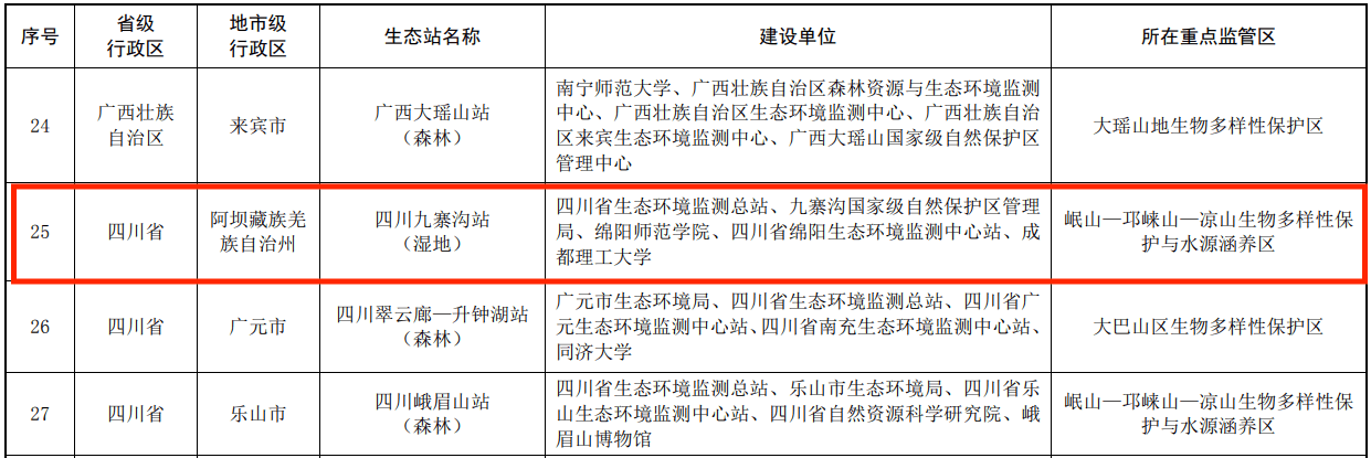 近日,中华人民共和国生态环境部办公厅印发《关于印发第三批生态质量综合监测站名单的通知》(环办监测函〔2026〕3号),正式公布了全国第三批生态质量综合监测站名单。由四川省生态环境监测总站、九寨沟国家级自然保护区管理局、绵阳师范学院、四川省绵阳生态环境监测中心站、成都理工大学联合申报的“四川九寨沟站(湿地)”成功入选。